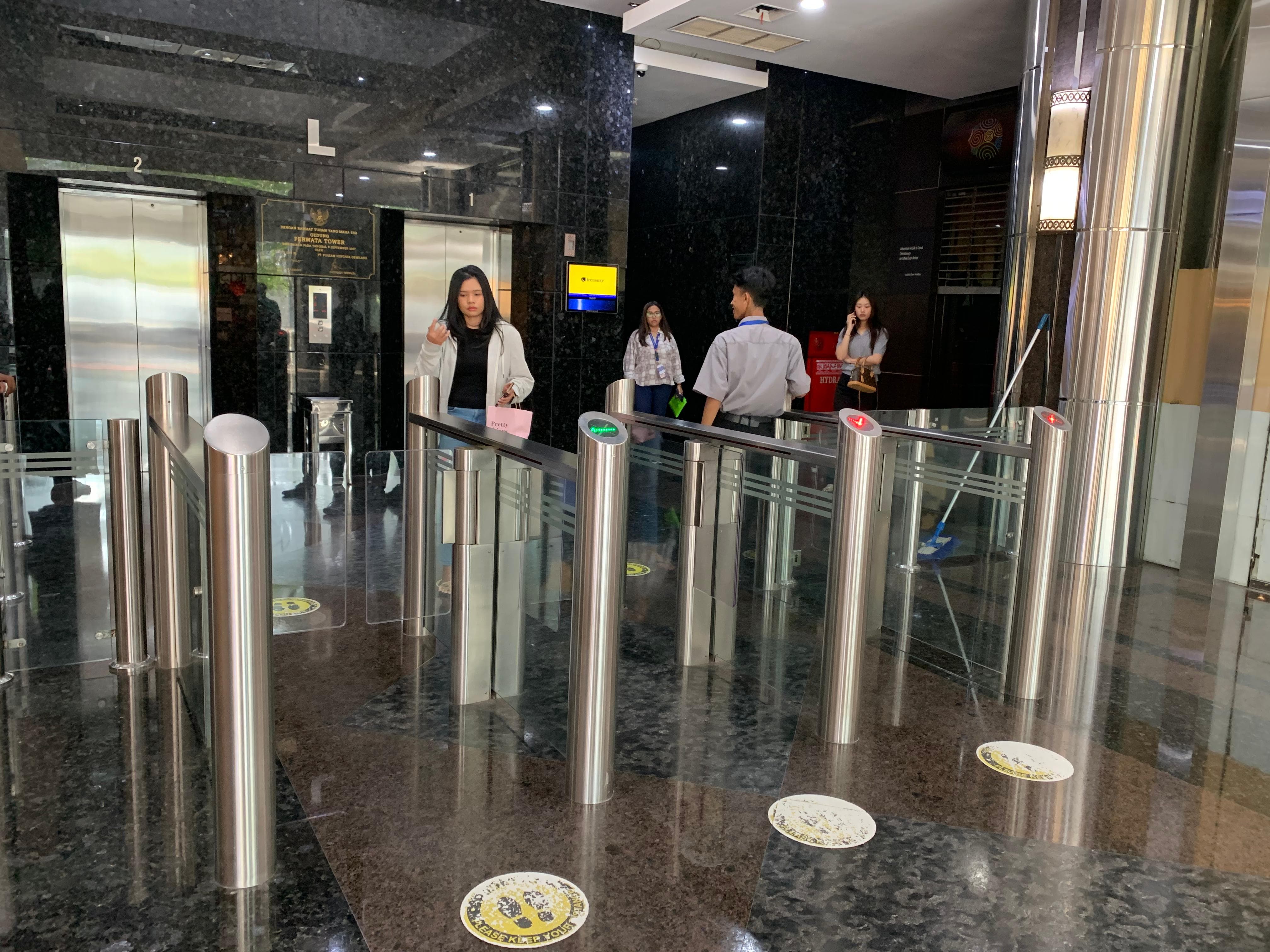 Swing gate Dormakaba terpasang dengan hasil presisi tinggi, menunjang arsitektur modern gedung dan berfungsi optimal dalam mengatur arus keluar-masuk orang secara otomatis dan aman. Solusi ini tidak hanya memperkuat sistem keamanan gedung, tapi juga memberikan kesan eksklusif dan profesional.